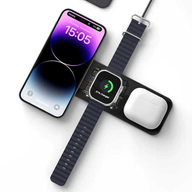 Зарядное устройство обеспечивает оптимизированную мощность для каждого из ваших устройств: 15W для смартфона, 5W для наушников и 2.5W для часов. Такое разделение мощности гарантирует быстрое и безопасное зарядное время. Современный USB-C порт обеспечивает удобное и быстрое подключение, гарантируя стабильную передачу электроэнергии и эффективную зарядку для всех ваших устройств. А также может складываться, чтобы не занимать много места при переноски.